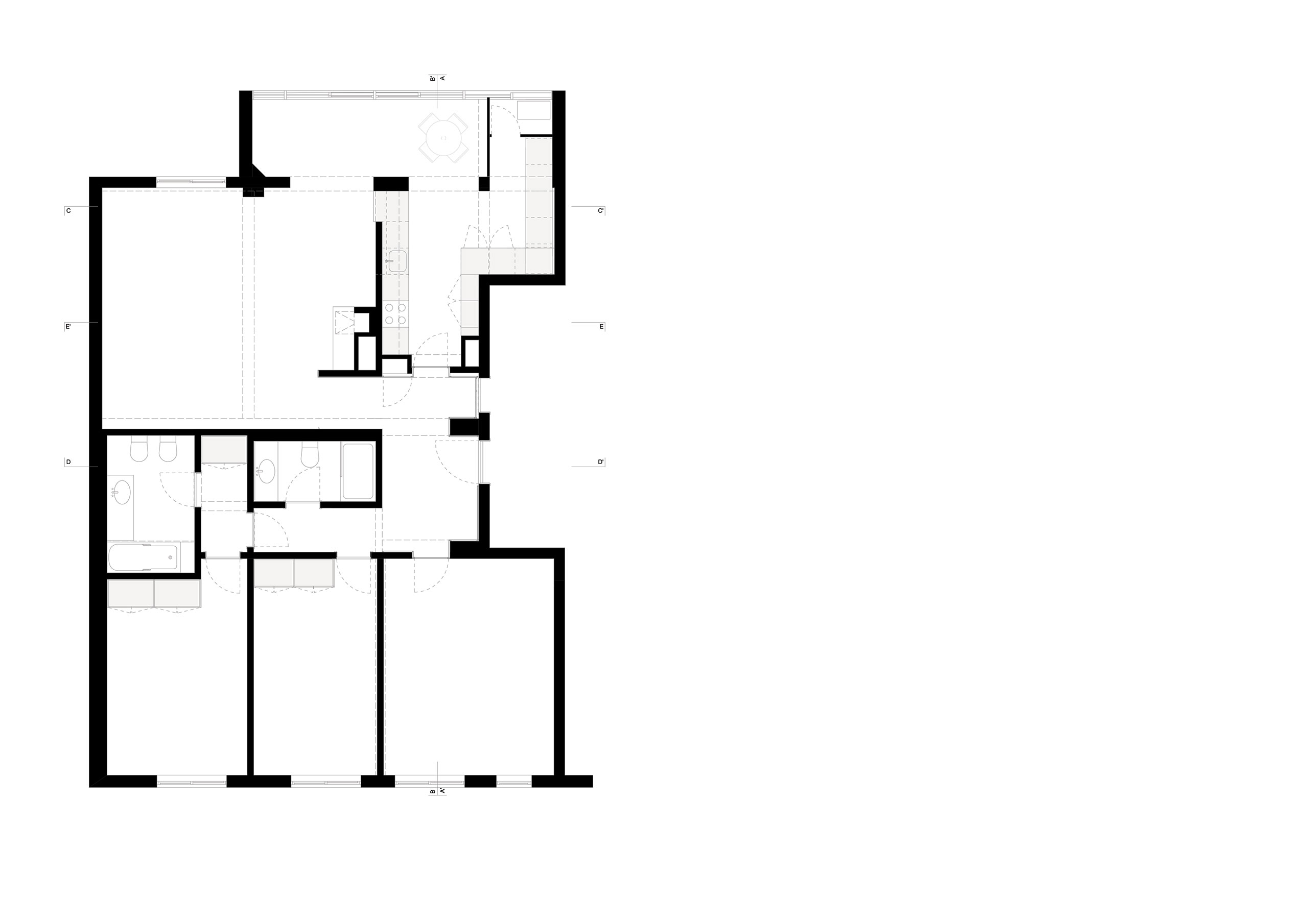 Remodelação integral do apartamento, com reorganização de layout e distribuição dos espaços. Foram aplicados novos revestimentos e remodelação integral da cozinha e uma das casas de banho. A outra casa de banho foi mantida pela qualidade de desenho e materiais, tendo no entanto sido substituídos alguns mosaicos por outros também originais.